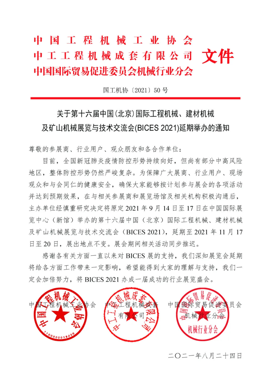关于第十六届北京工程机械展BICES 2021延期举办的通知