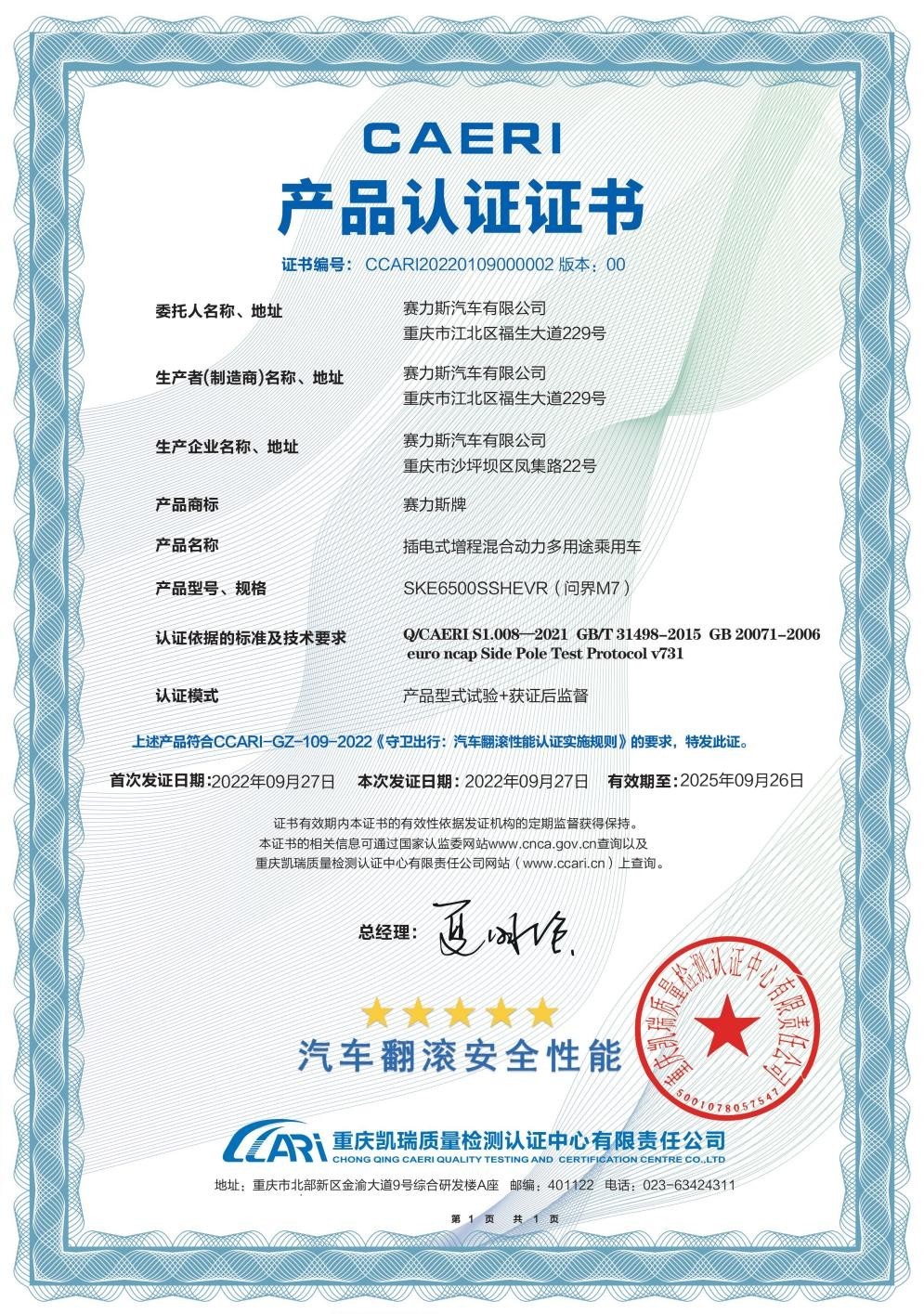 近日,中国汽研为问界M7颁发了汽车翻滚性能五星安全认证,本次“翻滚防护之星认证”中,问界M7不仅顺利通过全部测评,并且多项关键指标远优于检测标准,安全力再获认可。