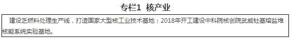 (一)加快发展核产业。围绕国家核工业布局,分阶段加快推进酒泉国家级核技术产业园建设,发展乏燃料后处理为主的核燃料循环产业,地企合作发展相关配套产业,打造国家大型核工业技术基地。发挥钍、盐等关键原材料资源优势,加强与中科院上海分院应物所合作,2018年开工建设中科院核创院武威钍基熔盐堆核能系统实验基地。以钍基熔盐堆核能系统项目为龙头,带动原材料、装备制造等上下游配套产业发展。加强熔盐储热、高温制氢等技术研发应用,促进核能技术与风光电产业、煤化工产业深度融合。