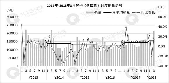 自2014年轻卡销量断崖式下降后,市场表现一直处于低迷状态。2017年市场开始回暖,全年销量达到171.9万辆。2018年1-3月,轻车累计销售46.4万辆,同期累计增幅7.4%,延续了同期增长趋势。