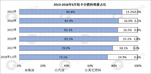 柴油轻卡占比最高,但呈现逐年下滑趋势,目前占比降至74.5%,汽油轻卡需求快速上升,占比增至24.9%。