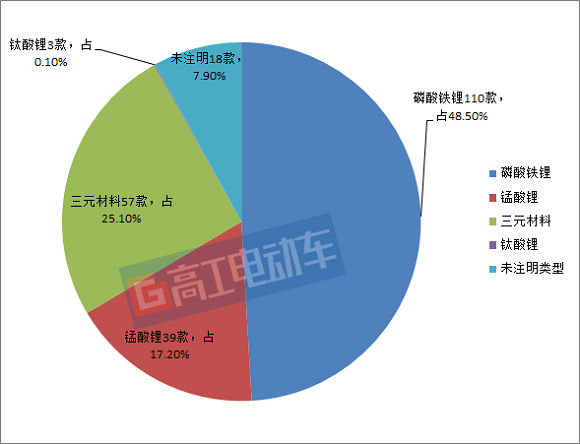 另外,从车型配套电池类型方面来看,在227款新能源车中,搭载磷酸铁锂电池的车型依旧占据着最大的份额,配套车型总数量有110款,占比达到48.5%,但相对于上一批新产品公告有所下降;而搭载三元材料电池的车型有57款,占比为25.1%,在新能源专用车和乘用车占绝对优势;搭载锰酸锂电池的车型则有39款,占比17.2%;搭载钛酸锂电池的车型有3款,占比0.1%。另外还有18款车型未注明电池类型。