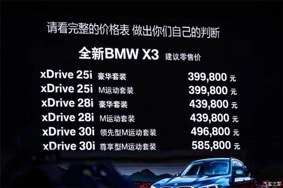 2018年7月2日,华晨宝马X3新增两款28i车型,售价为43.98万元。新车型仍搭载2.0T发动机,最大功率为165kW(224马力),介于25i车型(184马力)与30i车型(252马力)之间,进一步丰富了用户的选择。详细车型请见下表。