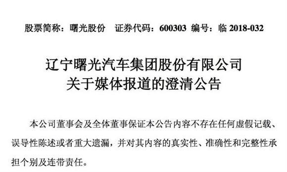 辽宁曙光在澄清公告中表示,协议签订,华泰汽车向共管账户支付了3亿元履行保证金,此后又通过共管账户向曙光集团支付了7亿元股权转让款。曙光集团与华泰汽车5.28%的股份转让过户登记手续也于2017年7月25日办理完毕。