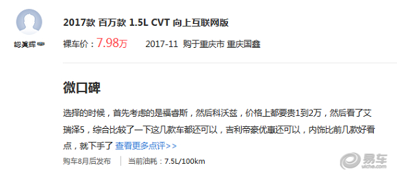 帝豪销量坚挺源于超高的性价比和外观设计,我们在易车网购买帝豪的消费者反馈中发现:90%的购买理由都是“价格低”、“样子不错”。目前2018款帝豪指导价为6.98万--10.08万元,对价格敏感的入门级轿车购买者来说吸引力很大。