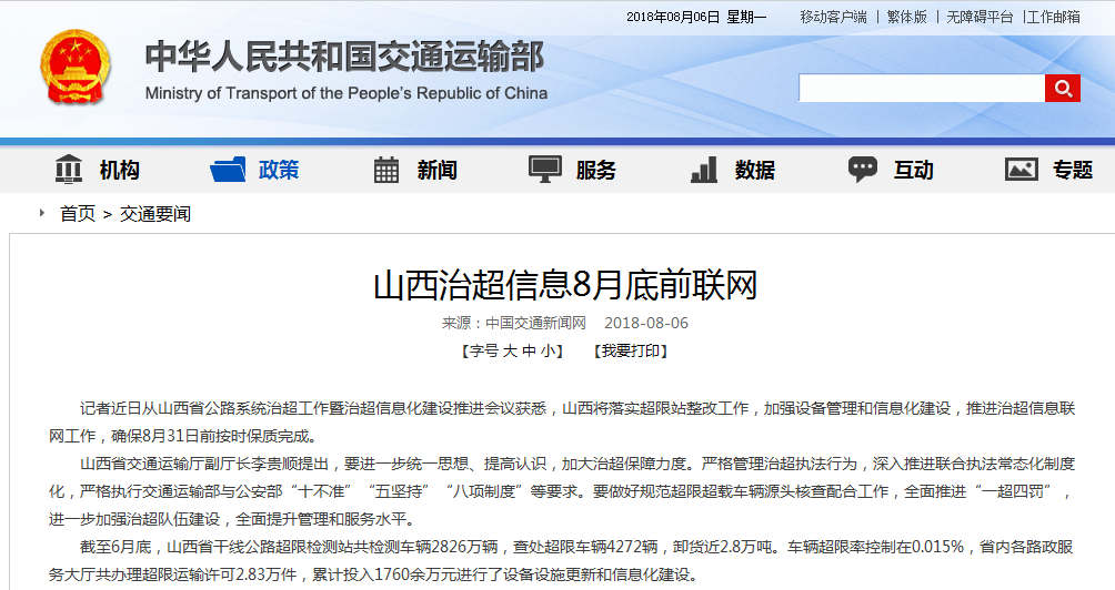 山西治超信息8月底前联网 对超限车“零容忍”