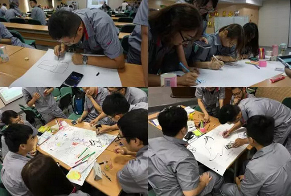 在培训过程中,新锐们专心致志,认真积极地配合老师每一个环节。培训老师在中午分配了每组完成一幅宣传海报的任务,每个小组都分配了各项工作:有的负责海报创意、有的负责草图绘制、有的负责后勤润色、还有的似乎在“侦查敌情”,生怕自己落后于集体。每一个新锐都自愿牺牲午休时间,积极努力地进行海报的合作制作,