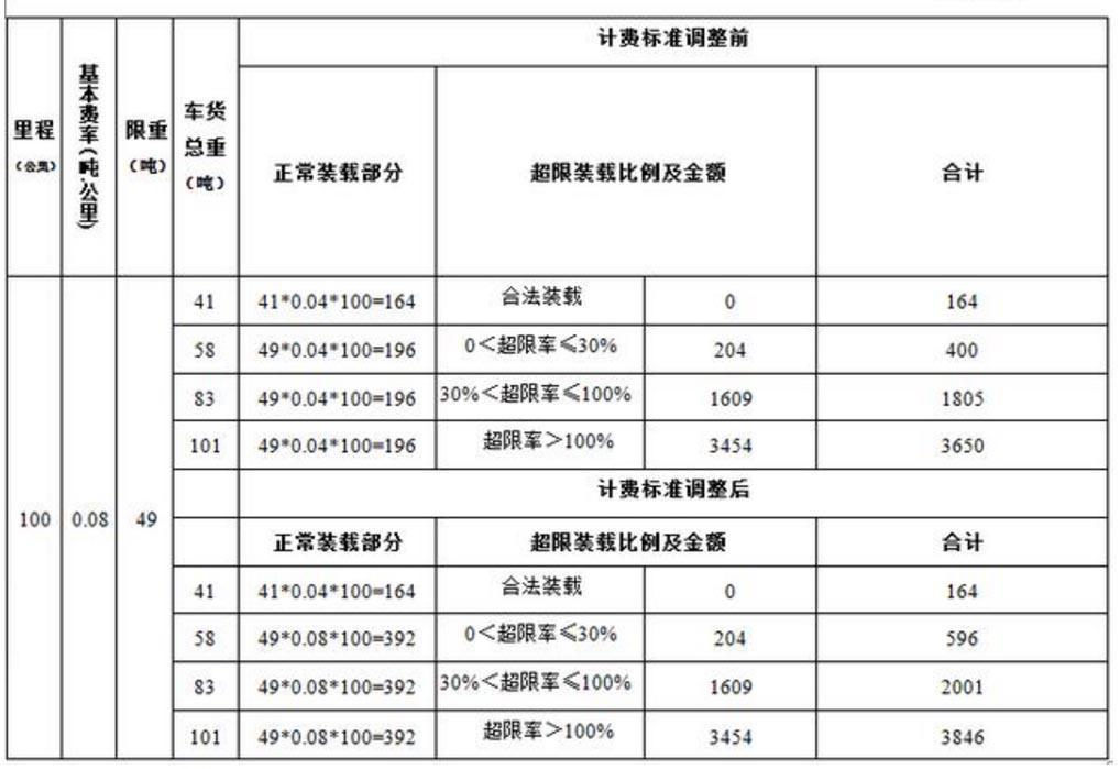 按照现行的计费标准,超限超载载货类汽车的处罚方案相对柔和,无论超载率高低,正常装载部分的基本费率都保持不变。而新规实施后,超载的司机们日子就没那么好过了。举个例子,一辆总重量限值为49吨的货车如果在新规实行后超限行驶,正常装载部分的费率将按0.08元/吨.公里计算,合计将多缴纳接近200元费用。
